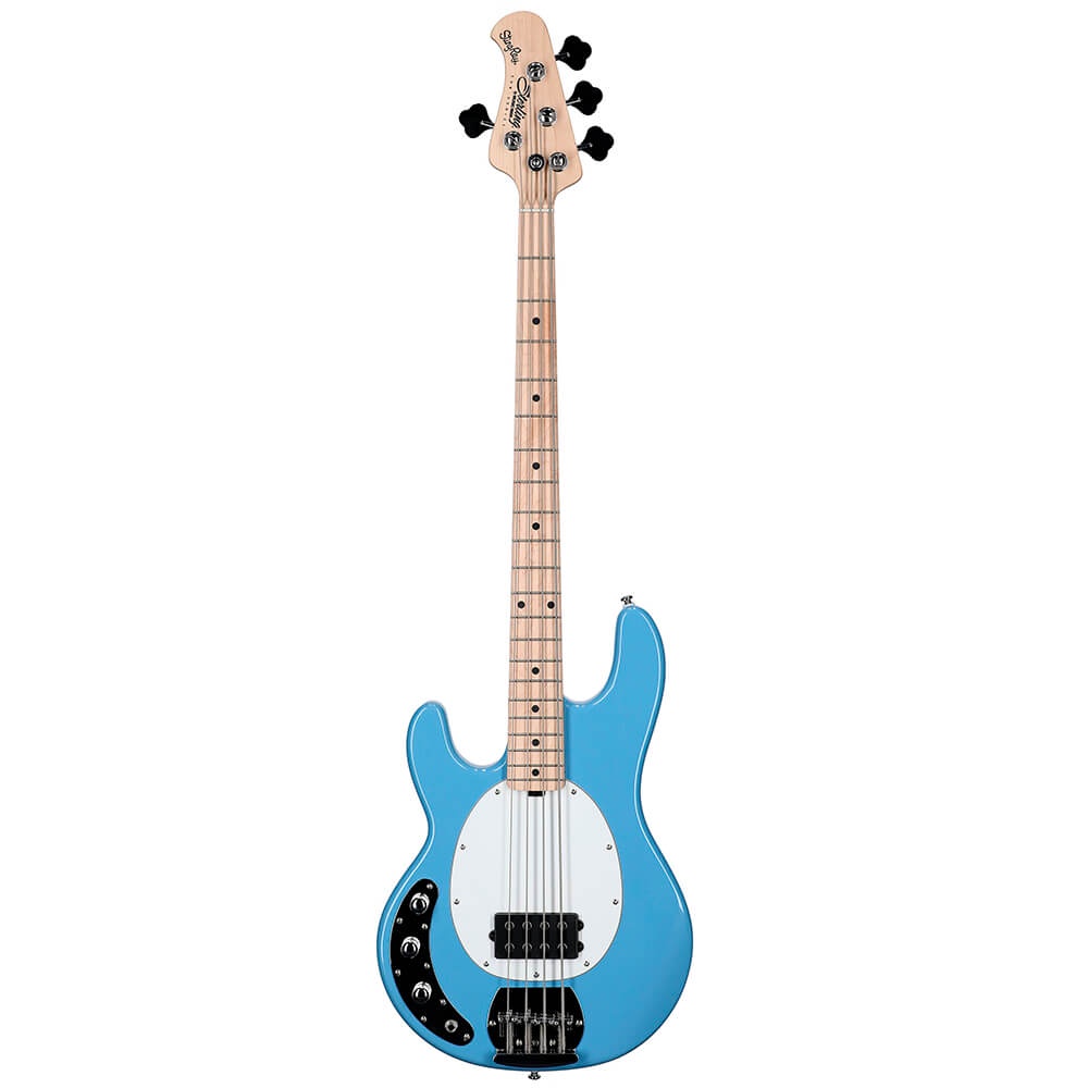 O baixo StingRay RAY4 para canhotos possui um pré-amplificador ativo de 9 V, um captador humbucking de baixo ruído e uma