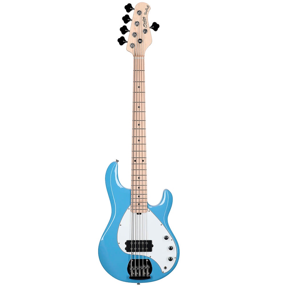 O baixo StingRay RAY5 de 5 cordas possui um pré-amplificador ativo de 9 V, um captador humbucking de baixo ruído e uma ponte resistente totalmente ajustável.