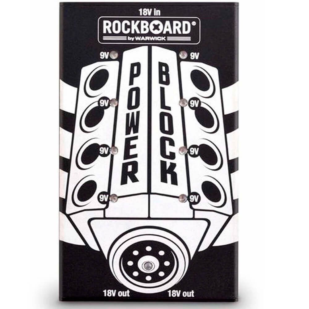 O RockBoard Power Block é uma fonte de alimentação compacta, fornecendo corrente para 10 pedais de efeito. Além da saída de 8 x 9 V (150 mA cada), o bloco de alimentação tem também saídas de 2 x 18 V (400 mA cada). Esta fonte de alimentação fornece saída total de 2.000 mA e vem com 10 cabos de conexão, bem como um adaptador de rede.