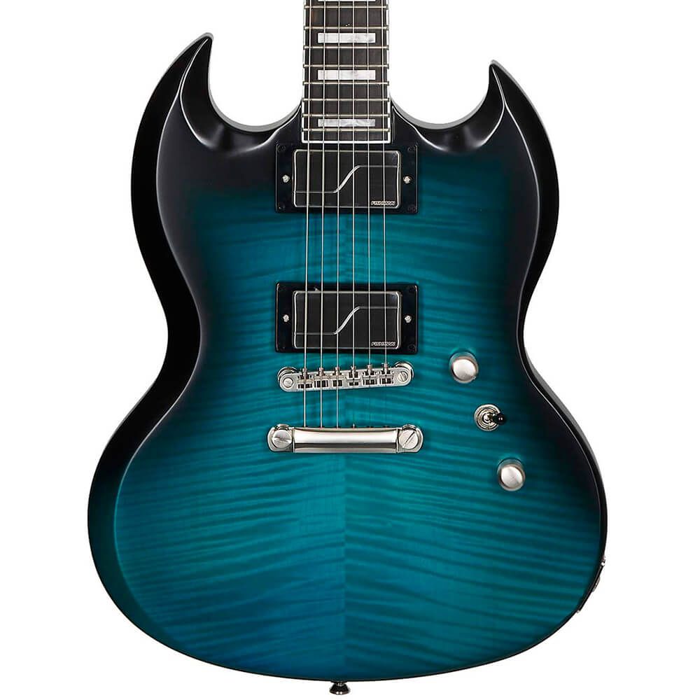 A linha Epiphone SG Prophecy traz alta performance ao design clássico da SG, tornando-a uma excelente escolha para os guitarristas progressivos dos dias atuais. O corpo em mahogany coberto com uma camada de 3/4" de maple e finalizada com uma maravilhosa folha de flamed maple AAA, tudo com acabamento Aged Vintage Gloss. Essas guitarras vem com braço em mahogany de perfil SlimTaper assimétrico com escala em Ebony de 24 trastes, trastes jumbo e marcação com blocos e triângulos com insertos de abalone combinando com a cor do corpo. As tarraxas Grover Locking Rotomatic em níquel escovado e o nut é em Graph Tech NuBone na cor preta. Todo o hardware das guitarras é em níquel escovado e elas vêm equipadas com dois captadores Fishman Fluence, que oferecem três opções de saída selecionadas através dos controles de volume e tone com push/pull: uma mais quente no estilo vintage dos humbuckers PAF, uma outra mais moderna com som poderoso de humbucker ativo e por fim, uma com som brilhante e otimizado de single-coil.