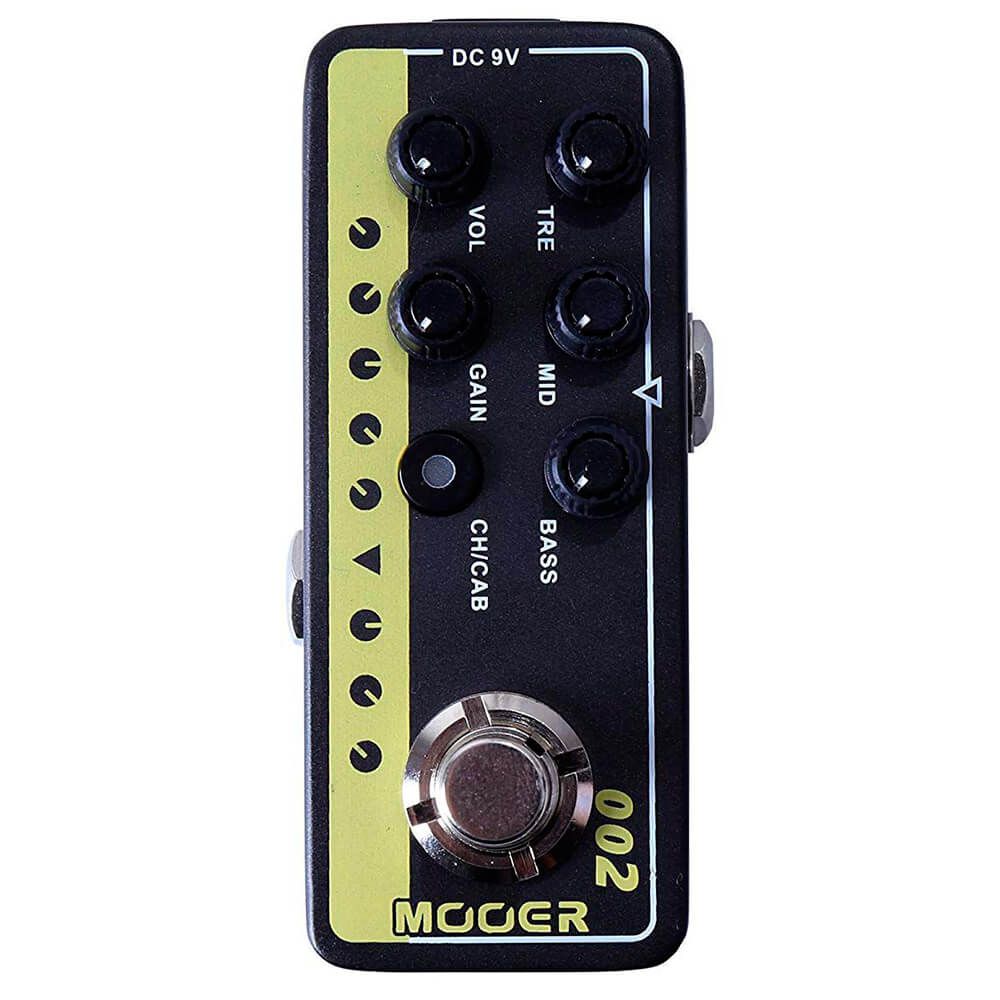 Pedal micro pré-amplificador Mooer 002 UK Gold 900, dual channel, EQ de 3 bandas, controles de ganho e volume para cada canal, simulador de gabinete/falante, dois modos de operação do footswitch.