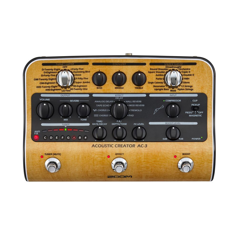 Se você está tocando com palhetadas leves ou tocando com mais intensidade, o compressor de único controle do AC-3 é um dos mais finos que você já ouviu. O compressor de controle único da Zoom facilita suavizar e controlar a dinâmica de seu instrumento para um som balanceado. Além disso, o indicador LED do compressor simplifica o ajuste de parâmetros de dinâmica durante uma apresentação ao vivo.