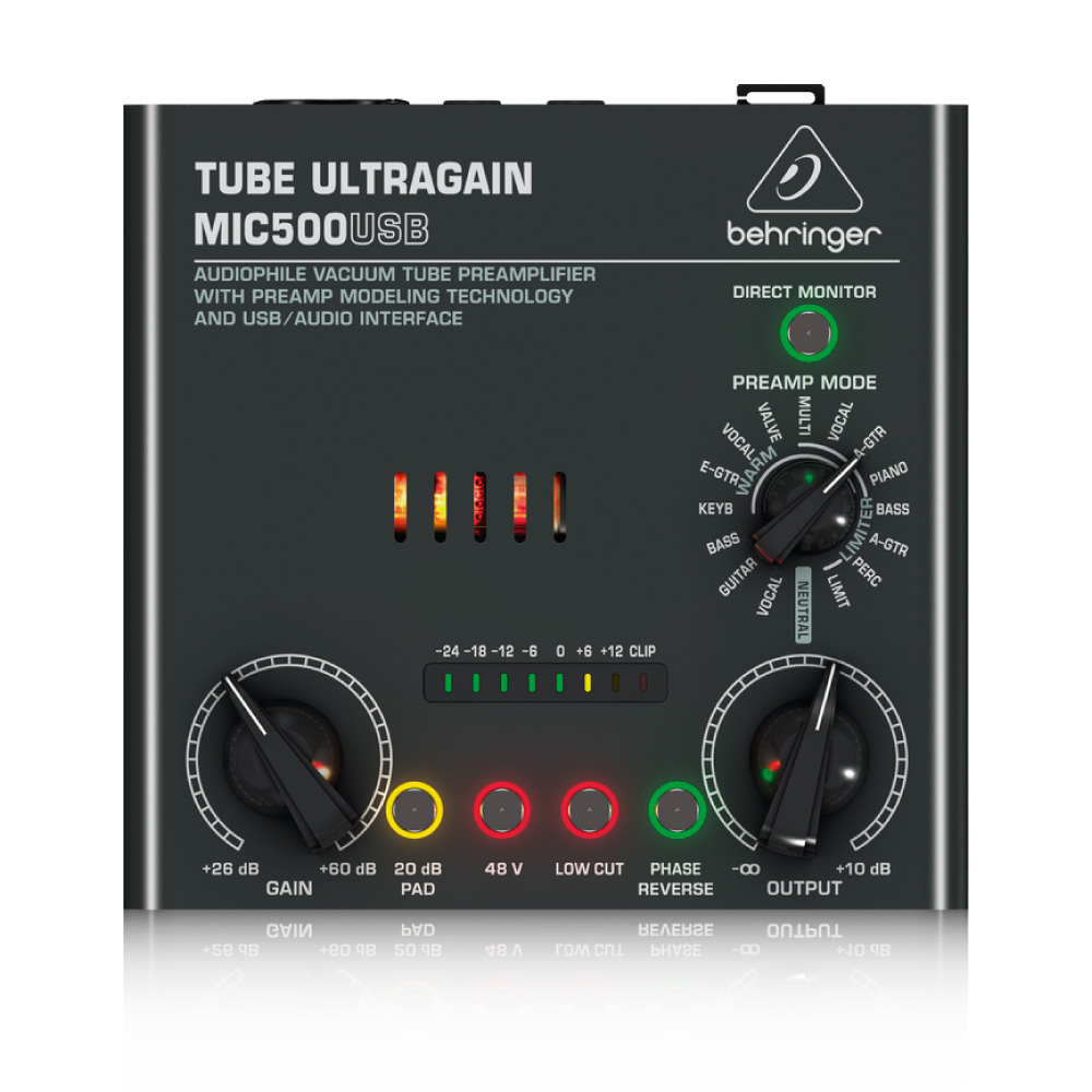 O pré-amplificador valvulado TUBE ULTRAGAIN MIC-500USB da Behringer oferece a qualidade de som de um pré-amplificador valvulado vintage e uma caixa DI de alta qualidade tudo-em-um, além de uma interface de áudio USB embutida que permite gravar diretamente em seu computador. O tubo 12AX7 e o pré-amplificador selecionados à mão podem ser usados para aquecer um sinal rapidamente, dando-lhe profundidade e caráter em aplicativos para gravações, som ao vivo, podcasts, voice-overs e muito mais.