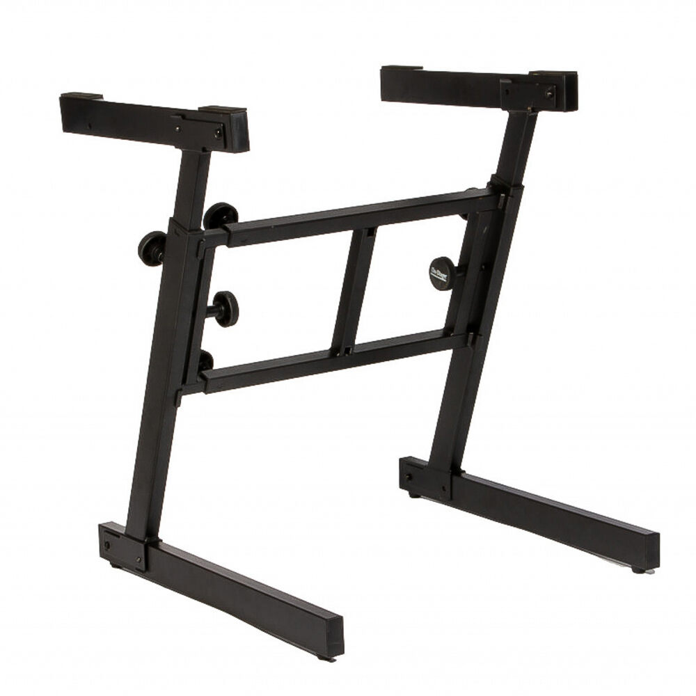 Pense em versatilidade Apenas este suporte compacto pode suportar 375 lbs (170.1 kg), permitir ajustes independentes de altura e comprimento, e dobrar-se para armazenagem fácil. O formato único em Z permite tocar de ambos os lados e pode ser dividido e travado em conjunto para transporte. Este modelo pode suportar teclados de 55 teclas na posição superior e até 88 teclas na inferior em seu comprimento máximo.
