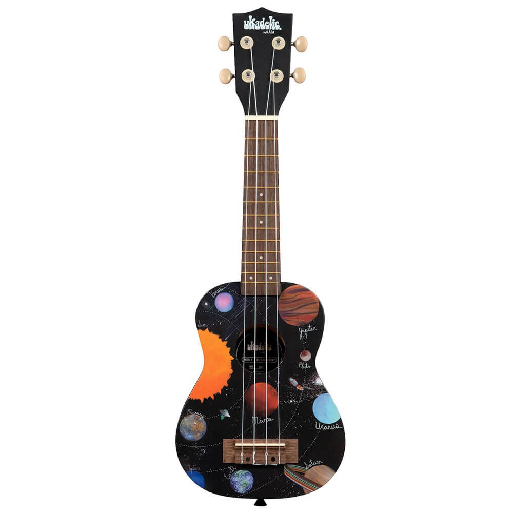 Como você encaixa todo o nosso Sistema Solar em um ukulele soprano? É muito difícil. A equipe de Kala assumiu essa tarefa astronômica, usando várias entradas do concurso como inspiração para a arte personalizada. Apresentando um foguete de corrida e um OVNI misterioso, o Spaced Out Ukadelic® mostra uma disposição divertida e colorida de nosso sistema solar - planetas, estrelas e tudo! Você não precisa ser um cientista de foguetes para tocar este ukulele!