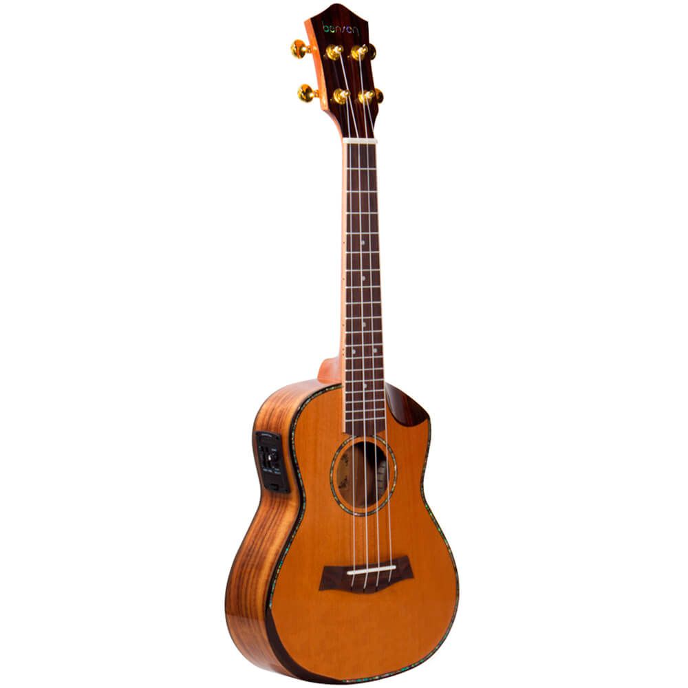 O UB-404SE-B possui tampo sólido em Cedar ideal para quem busca acordes cheios, com graves preenchidos para compor uma mixagem natural com outros instrumentos. Este modelo possui laterais e fundo em Koa madeira de origem havaiana considerada a mais clássica para construção de ukuleles, pelo seu timbre que realça os agudos e deixa os graves bem definidos. O braço do instrumento é feito de mahogany (mogno), uma madeira resistente, dura, e de alta densidade, garantindo aos ukuleles Benson alta durabilidade para que você possa transportá-lo em segurança e sem preocupações. A escala e o cavalete do 404S são construídas em Rosewood madeira ideal para compor um timbre rico, completo e balanceado.
